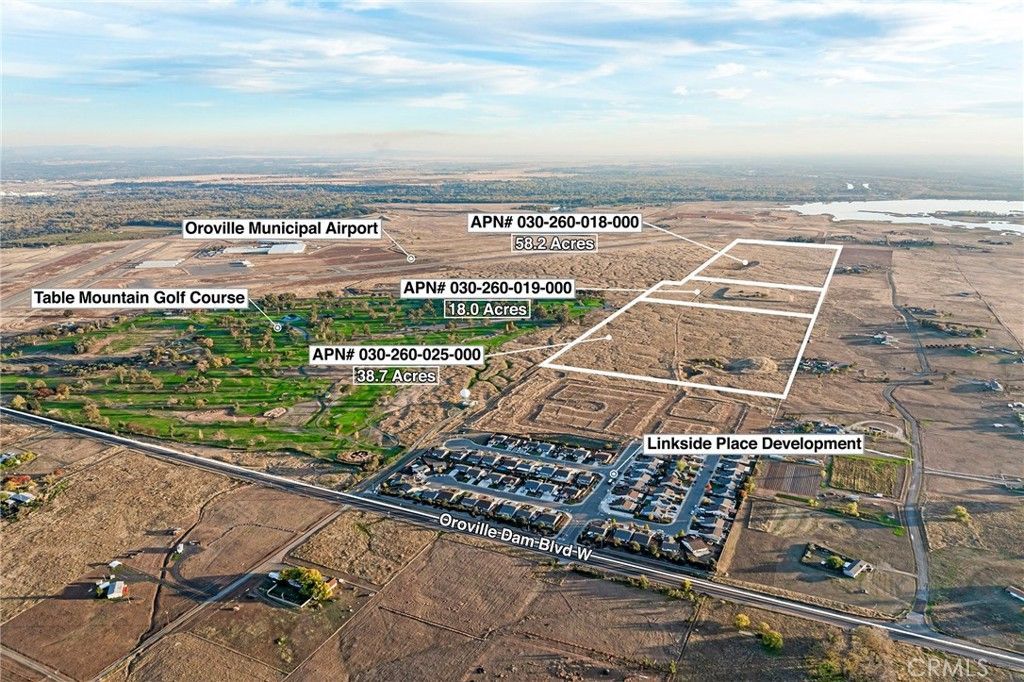 OWNER MAY FINANCE! PRIME GOLF COURSE DEVELOPMENT OPPORTUNITY with this 115± acre land offering located at the edge of the Oroville City Limits and directly adjacent to the 18-Hole Table Mountain Golf Course. Featuring approximately 2,200 feet of golf-course boundary frontage, this property presents exceptional potential for a rural-residential or golf-oriented development concept, including 5-acre estate lots under the current RR-5 zoning. The land borders Linkside Place Phase II to the north, including the tentatively approved Linkside Place Phase II subdivision consisting of 56 future homesites. Phase II has underground utilities already installed and roads graded, awaiting paving, signaling strong forward momentum for continued residential growth in this corridor. Linkside Place Phase I, just north of Phase II, was completed in recent past with 65 homes and demonstrates proven development success in this immediate area. This prime 115± acres is made up of three legal parcels: APN 030-160-019 (18.08± acres), APN 030-260-025 (38.79± acres), and APN 030-260-018 (58.24± acres). Just over 1,000 feet west lies the previously City-approved 421-acre Oro Bay master plan area, once approved for approx. 2,400 homes, showing the long-term development vision for this part of Oroville. Power, water, and sewer currently extend to Linkside Place Phase II at the northern boundary of this property. With Orovilles growing population, multiple new housing projects underway, and demand for quality development opportunities, this acreage sits directly in the path of expansion. Located just south of Oro Dam Blvd, the main connector between Highways 70 and 99, and approximately 4 miles to downtown Oroville, 25 miles to Chico, and 70 miles to Sacramento. Close to recreation including Lake Oroville, the Feather River, and the Afterbay recreation and boat launch facilities just up the road. Ideal for developers, investors, 1031 exchanges, or long-term land banking. Owner may finance a significant portion?submit terms for seller consideration. Priced at right around $20,000+/- per acre. Inquire with City Of Oroville for discussions on their current plans for this area on Annexation Into City Limits & Potentail Future Rezoning Ideas in conjunction with adjacent developments. OWNER MAY FINANCE WITH LARGE DOWN ON NEGOTIATED TERMS. INQUIRE FOR DETAILS.