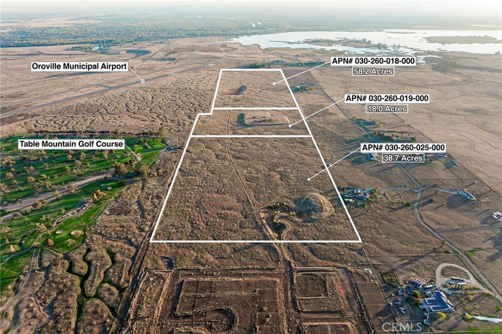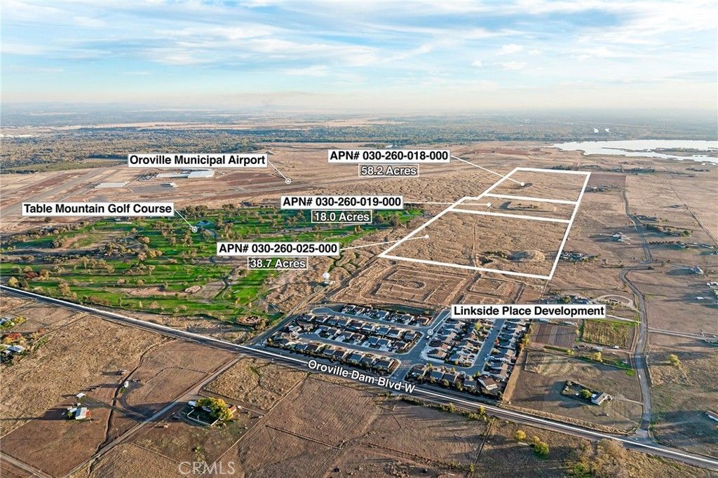 OWNER MAY FINANCE! PRIME GOLF COURSE DEVELOPMENT OPPORTUNITY with this 115± acre land offering located at the edge of the Oroville City Limits and directly adjacent to the 18-Hole Table Mountain Golf Course. Featuring approximately 2,200 feet of golf-course boundary frontage, this property presents exceptional potential for a rural-residential or golf-oriented development concept, including 5-acre estate lots under the current RR-5 zoning. The land borders Linkside Place Phase II to the north, including the tentatively approved Linkside Place Phase II subdivision consisting of 56 future homesites. Phase II has underground utilities already installed and roads graded, awaiting paving, signaling strong forward momentum for continued residential growth in this corridor. Linkside Place Phase I, just north of Phase II, was completed in recent past with 65 homes and demonstrates proven development success in this immediate area. This prime 115± acres is made up of three legal parcels: APN 030-160-019 (18.08± acres), APN 030-260-025 (38.79± acres), and APN 030-260-018 (58.24± acres). Just over 1,000 feet west lies the previously City-approved 421-acre Oro Bay master plan area, once approved for approx. 2,400 homes, showing the long-term development vision for this part of Oroville. Power, water, and sewer currently extend to Linkside Place Phase II at the northern boundary of this property. With Orovilles growing population, multiple new housing projects underway, and demand for quality development opportunities, this acreage sits directly in the path of expansion. Located just south of Oro Dam Blvd, the main connector between Highways 70 and 99, and approximately 4 miles to downtown Oroville, 25 miles to Chico, and 70 miles to Sacramento. Close to recreation including Lake Oroville, the Feather River, and the Afterbay recreation and boat launch facilities just up the road. Ideal for developers, investors, 1031 exchanges, or long-term land banking. Owner may finance a significant portion?submit terms for seller consideration. Priced at right around $20,000+/- per acre. Inquire with City Of Oroville for discussions on their current plans for this area on Annexation Into City Limits & Potentail Future Rezoning Ideas in conjunction with adjacent developments. OWNER MAY FINANCE WITH LARGE DOWN ON NEGOTIATED TERMS. INQUIRE FOR DETAILS.