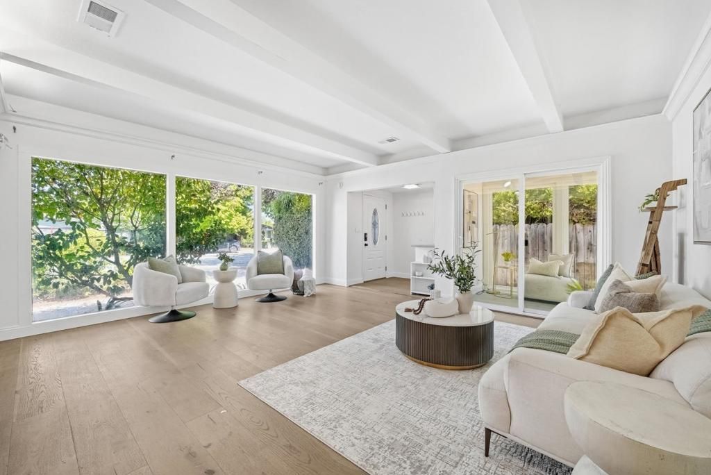 Welcome to this beautiful two-story single-family home in Sunnyvale, set on an expansive 8,850 sqft lot. A paved front path leads into a spacious living room with large view windows overlooking the front yard. The space flows seamlessly into a stunning kitchen featuring a center island highlighted by modern pendant lighting, stylish countertops, stainless steel appliances, ample white cabinetry, and recessed lighting. The connected dining room is perfect for gatherings, accented by a crystal ceiling light. The east hallway leads to bedrooms and an updated bath with a skylight, double vanity with quartz countertops, and a stall shower. Along the west hallway are additional rooms and a hallway bath with double vanity, quartz countertops, and a stall shower. A bonus sunroom sits at the back of the home. Upstairs features additional rooms and an office, along with an updated hallway bath featuring a double vanity, lighted mirror, and stall shower. The large backyard is ideal for outdoor activities. Additional features include solar panels, in-unit laundry, and an attached garage. Conveniently located near restaurants and parks such as Las Palmas Park, as well as groceries such as Safeway and Trader Joes. Enjoy great public schools and easy access to major tech companies.